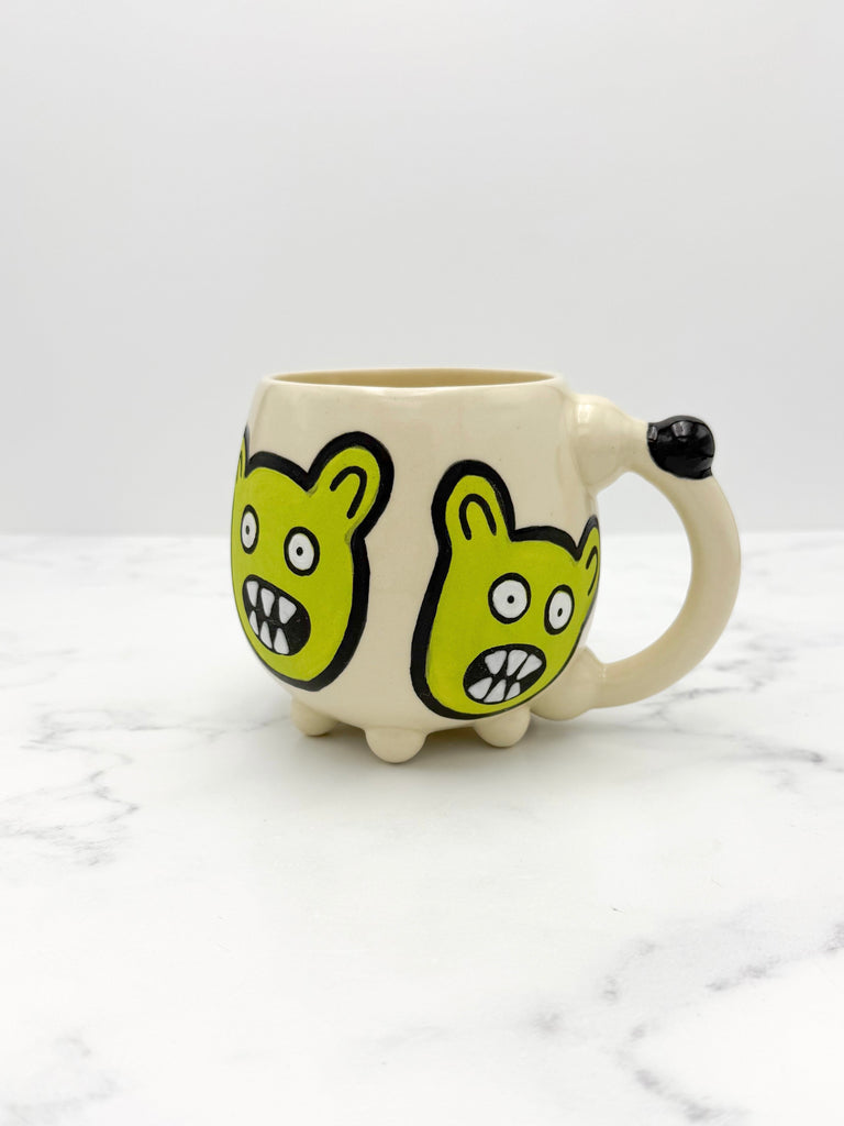 This mug is microwave and dishwasher safe, but hand wash is recommended. The bear faces are a matte glaze that contrasts with the clear glossy glaze on the mug. Enjoy!
